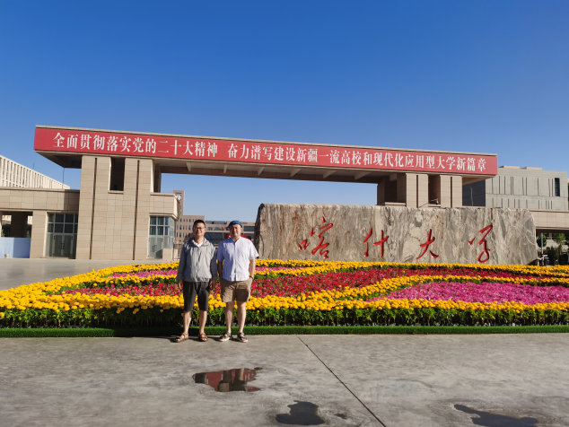 在喀期间,周韧教授、董军教授应喀什大学美术与设计学院王奇老师热情邀约前往喀什大学进行参观与交流,炎炎夏日下一行人参观了喀什大学的校园设施以及丰富多彩的文化活动场所。两位教授对喀什大学在高等教育方面所取得的成就表示赞赏,并对学校在教学与研究方面的发展成绩给予了高度认可。此外,双方还就未来在学术和专业领域上的交流合作前景进行了探讨。