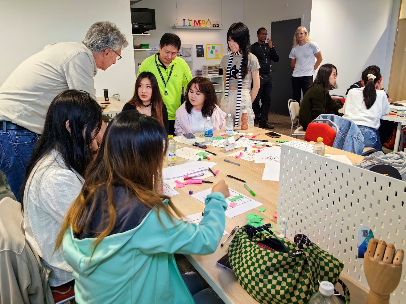 工作坊期间,老师们每天都会为同学们安排相应练习任务。第一次任务由同学们自由分组,之后的分组则由老师随机组合。制作期间,各位老师会为同学们答疑并提供帮助。在每天下课前,老师们都会组织打乱全班同学、重新分为三组,每组内进行小组会议,交流每人在当日的收获与不足。随后全班准时一起进行每日站立会议。在会议上,每位小组代表总结小组会议时每位同学的观点进行汇报。最后一天Per教授邀请了业内专家和学校老师与朋友来观看各小组的汇报,测试他们的游戏并进行反馈。