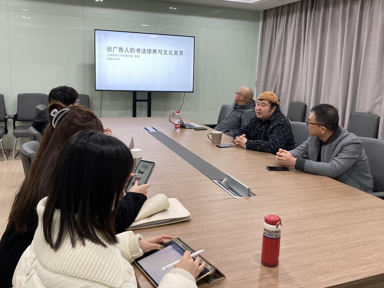 2024年3月18日18:00,云南师范大学传媒学院副教授、上海师范大学访问学者黄毅老师,于东部校区文馨楼5楼会议室举办了《谈广告人的书法修养和文化美育》学术讲座。本次讲座由影视传媒学院周韧教授担任学术主持,广告学专业戴菲副教授及新闻与传播相关专业的研究生们也共同参与了此次讲座。