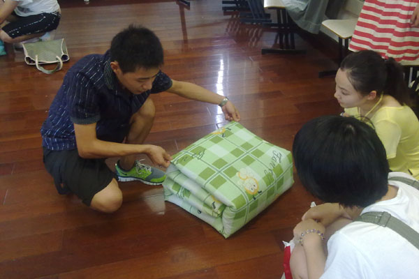 军人出身的王俊杰老师和上海公安边防总队的现役军人刘教官现场示范,亲自指导。一床软软的棉被在二位教官的手中瞬间变得整齐有型,赢得学生们的阵阵喝彩!看完教官的示范,学生们个个摩拳擦掌,迫不及待的想要一展身手!