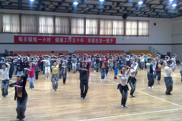 10月3日下午一点,在徐汇校区球类馆三百多名参加世博会闭幕式演出的演员们精神抖擞、状态饱满的投入第一次合排,演员里大多数是在读的大学生,也有不少社区的中老年朋友。谢晋学院的演员共有25名,其中20名为一零级主持班新生。