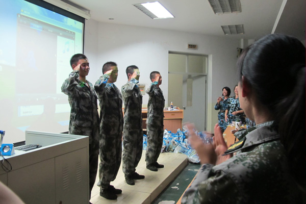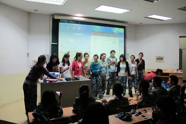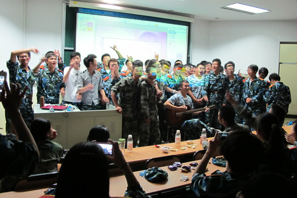 为期一周的军训圆满落下帷幕,我院于9月20日晚18:30在奉贤校区四教D座200教室举办2011级新生军训欢送教官联欢晚会。院办副主任张慧芳、辅导员王姬文、高已原和一排九连4名教官以及全体11级新生参加了联欢活动。