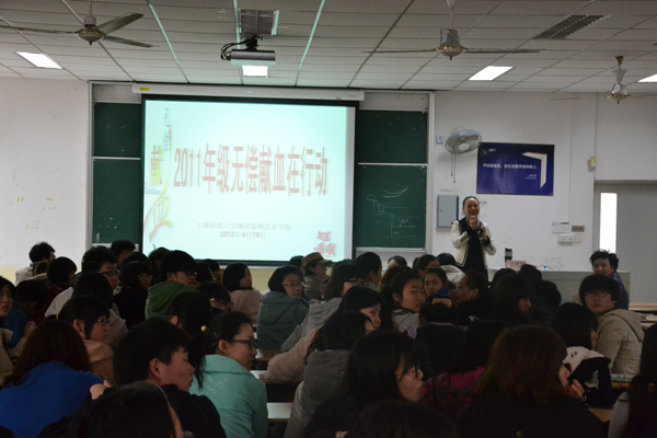 2012年4月18日下午2点,上海师范大学谢晋影视艺术学院副院长兼副书记孙雅艳老师来到奉贤校区第四教学楼A座119,与来自我院大一年级的同学约200余人齐聚一堂,动员大家进行无偿献血。