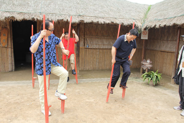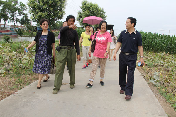经过这段美妙之旅,党员教师们来到了学习考察的第一站——前卫村,前卫村于1969年从一片滩涂中围垦并崛起的村庄,经过30多年的艰苦创业,目前已形成集农、工、商、旅、教全面发展的生态村。昔日一片荒凉沉寂的小村,如今是既具城市风光,又有田园诗意。这里水洁、土净、空气新鲜,花果绕村争香斗艳,景点观光千姿百态,树木成林鸟语花香,漫步绿荫碧水之间,疑是桃花源中行,使人感到人与自然的高度和谐。党和国家领导胡锦涛、朱镕基、尉健行、吴邦国、温家宝等先后来村视察。党员教师们漫步参观,院长赵炳翔和党员教师张捷诚等饶有兴趣地玩起了踩水车、踩高跷等农家游戏。