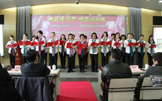 在学校的表彰会上,我院党总支书记高亭代表全院女教师从校党委书记陆建非手中接受了奖牌。更加值得一提的是,我院全体女教师朗诵的由我院女教授、博导翁敏华连夜创作、院长赵炳翔即兴策划构思、副院长邱乙哲导演、播音与主持专业刘阳、王宇、姜杉三位女教授领诵的《我赞美,节日里的巾帼群英》震惊了全场,女教师们身着由院工会主席连颖、委员王梅购置的白衬衫、系上五颜六色的围巾,激情讴歌在自身及周围平凡岗位上作出不平凡成绩的女教职工们,展现了积极向上的精神风貌。为了展示出我院女教师最亮丽美好的精神状态,全体女教师在繁忙的教学科研、艺术实践、照顾家庭之中挤出时间,克服困难,认真排练,除了出国访学、怀孕产假的女教师,一位也没有缺席。