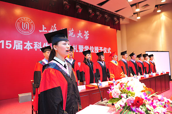 在高昂雄壮的国歌声中拉开本次毕业典礼的序幕,参加此次毕业典礼的有:2015届全体毕业生,上海师范大学副校长刘晓敏、校友戎立斐、学院院长赵炳翔、党总支书记高亭、副院长丁宏法、邱乙哲、徐君,学位委员会委员高祥荣、孙美娜、涂晓,院工会主席连颖、专业负责人强小柏、王翔宇,教师代表以及家长代表等。毕业典礼由学院党总支副书记、副院长孙雅艳老师主持。