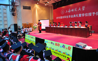 6月19日上午,上海师范大学谢晋影视艺术学院2015届本科生毕业典礼暨学位授予仪式在东部教苑楼多功能厅隆重举行。毕业生们身着学士服在签名墙上签名留言,走红毯步入会场。典礼开始之前,同学们抑制不住兴奋的心情,在现场载歌载舞,庆贺这场毕业的盛宴。出席毕业典礼的领导和老师们在毕业生的欢呼声中步入会场。