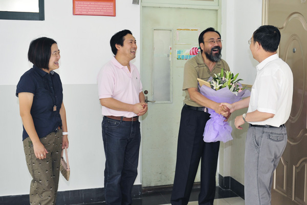 第27届教师节前夕,9月8日上午,校党委副书记茅鼎文在我院院长赵炳翔、党总支书记高亭、校办同志的陪同下,前往我院教师糜曾家中,慰问了糜老师。返回学校后,茅鼎文副书记立刻前往教苑楼D座303教室。慰问看望了正在给10级表演专业学生上课的康爱石老师。 茅副书记给这两位老师送上了鲜花和慰问品,感谢他们为我校的人才培养所作的努力和付出,鼓励他们继续为学校、学院的发展作贡献。