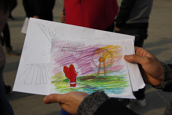 谢晋影视艺术学院2013级的同学们积极踊跃的参加了本次比赛。现场同学们组织了各类丰富多彩的活动,如:即兴表演、作画募捐、志愿者展览板展示等活动。张晓彤、李超、徐瑛、施樱、王雅琦等几位来自动画班的同学都带上了自己的画板为前来募捐的爱心人士免费画一张速写。他们认真工作的态度、无私奉献的精神展示了志愿者的风采。来自表演班的李节浩、任潇雨,主持班的苏秦宇等几位同学手拿募捐箱,在操场的四周募捐爱心善款,为贫困山区的孩子们献爱心。