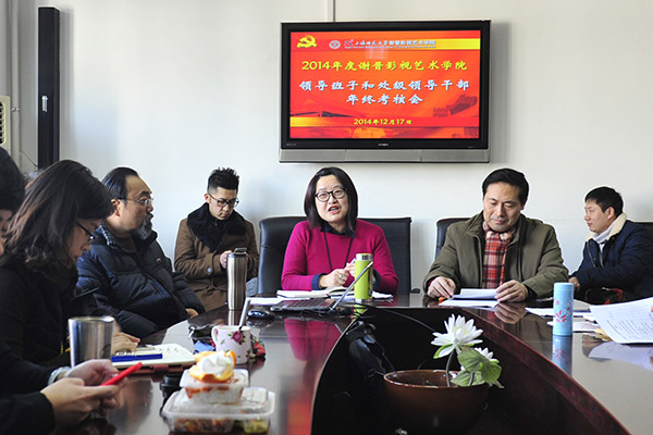 会上,赵院长代表学院领导班子对2014年度工作进行总结。在过去的一年中,学院领导班子带领全院教职工恪守本职、兢兢业业,在党建工作、学科建设、教学改革、学生工作、艺术实践、国际交流与合作、校庆60周年工作、民生与凝聚力建设等各方面都取得了丰硕的成果。听取总结后全体教职工前往教苑楼B座二楼机房,从网上阅览了我院6位处级领导干部每人上传的2014年度工作小结,大家对学院领导班子和领导干部个人进行了网上考核。