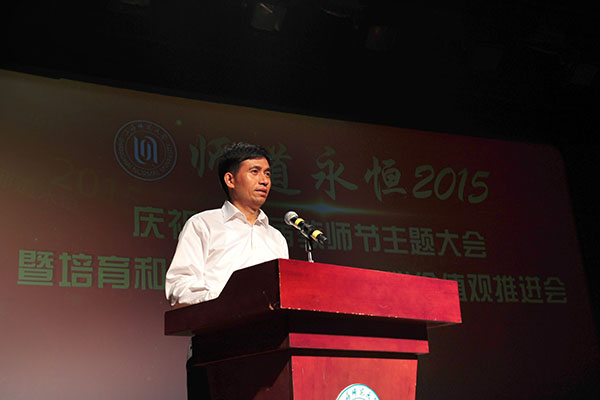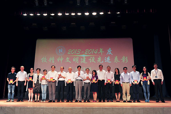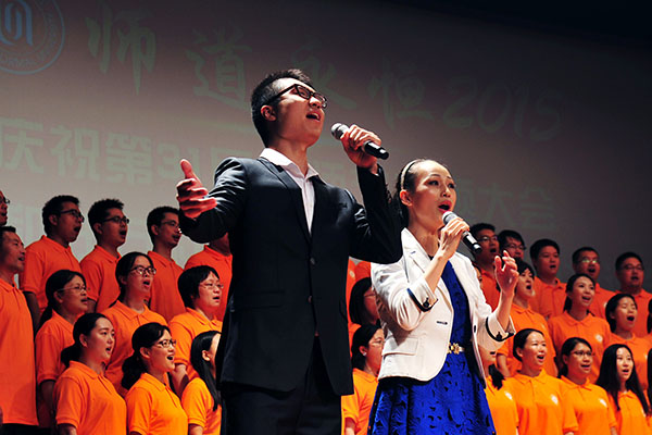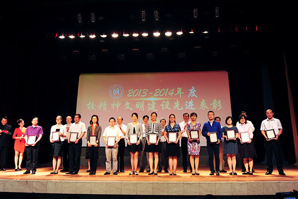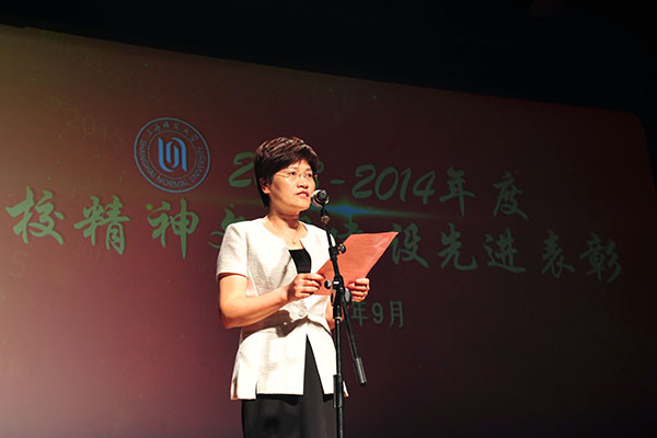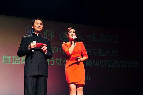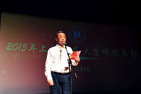 从9月16日学校隆重召开的“师道永恒2015:庆祝第31届教师节主题大会暨培育和践行社会主义核心价值观推进会”上传来好消息:荣获“全国师德楷模”的我院党总支副书记副院长孙雅艳老师、“2014年度校精神文明十佳好人好事”获得者朱恒夫教授以及荣获“2013-2014年度校A级文明单位”我院集体受到了表彰。 曾获“上海市育才奖”荣誉的我院翁敏华教授作为嘉宾为“2015年度校优秀教师、校优秀教育工作者、校服务明星、第四届王乐三奖教金获得者颁奖”;我院青年教师、博士周胜南、博士在读王宇两位老师作为青年教师代表参加了由孙雅艳老师领唱的《老师,你我共同的名字》的大合唱;播音与主持艺术专业负责人、博士在读高祥荣副教授和我院研究生王博以师生档联袂主持了大会;广播电视编导专业负责人王翔宇副教授、李栋老师制作了孙雅艳老师的视频作品;副院长徐君、院工会主席连颖老师做了相关的协调工作。