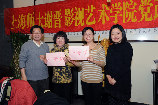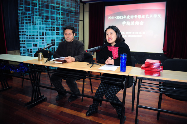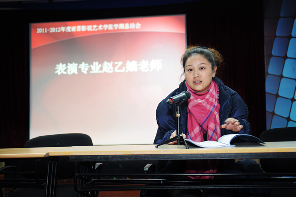 会上,党总支书记高亭宣读了我院2011年度表彰名单,院领导们为获奖老师们颁奖。之后的交流发言中,表演专业赵乙嫱老师作了题为“俄罗斯小品工作坊在大戏”家”的排演中的运用”的发言;主持专业姜杉老师作了题为“微言博义”的发言,介绍了主持专业教学中“微博”的运用;动画专业施屹教授介绍了水墨动画在动画专业教学中的探索和实践;科研副院长翁敏华教授介绍了如何从教学中提升理论,并用科研反哺教学;办公室主任翁晓玲老师作了主题为“如何做好教学保障”的发言,介绍了行政老师的分工,并挖掘如何为教学做好服务保障;学工组组长王姬文老师介绍了辅导员的工作的艰辛,几经动情,潸然泪下。