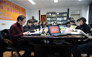 验收组一行在听取了我院院长、项目组负责人赵炳翔的精炼的汇报后,观看了富有震撼力的视频短片以及聆听了我院分管科研副院长翁敏华教授、分管教学副院长邱乙哲、广播电视编导专业骨干青年教师许迪声分别就教材著作的编撰、教学工作坊的开展以及科研创新课题的研究汇报。