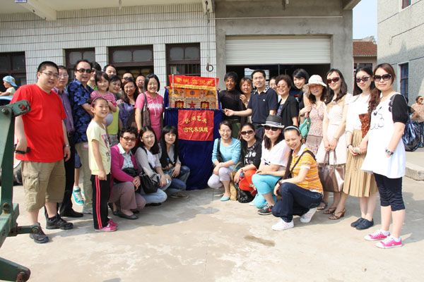 在享用了美味的农家菜后,作为本年度我院教工党支部的“寻找民间的艺术生命——‘从民俗表演看非物质文化遗产传承’支部立项,在我院民主党派人士、副院长翁敏华老师提议下,党员教师们又来到了“上海市非物质文化遗产——崇明扁担戏”传承人朱顺发位于崇明胜利村的家中,观赏这一民间艺术。崇明扁担戏被誉为世界三大木偶戏之一,因其“一副扁担一台戏,一人演戏百人看”而得名,是我国仅存的单人布袋木偶戏。传承人朱顺发在自家门前的晒谷场上用一副扁担、一块布搭起一方舞台,演起了《水浒传》片段。一个个人物活灵活现,说噱逗唱惟妙惟肖,为在场的我院党员教师们带来了一场原汁原味的民间艺术演出。