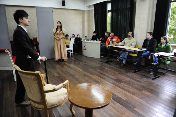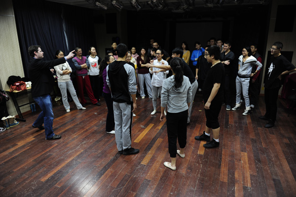 双方互相介绍了各自学院表演专业的教学体系,授课方式,教学模式等具体情况,并在交流中发现许多互通的地方,而所有的教学理念的核心都源于斯坦尼斯拉夫斯基表演体系。此次Iain 教授来访将重点洽谈我院2013年赴英国参演爱丁堡国际艺术节的事宜。因此Iain 教授专门为大家详细介绍了一年一度在英国爱丁堡举办的爱丁堡国际艺术节的演出申请、场地租借、印制海报、演出形式和要求、演出费用等等一系列参演程序与流程,并花了整个下午观摩了表演专业10级本科班两组学生的自选片段的汇报,并观看了表演班学生之前的演出视频。Iain教授建议:富有中国元素的演出会比较适合在爱丁堡国际艺术节上参演。