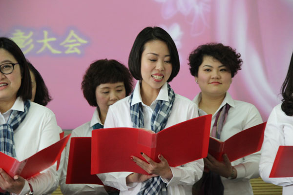 在学校的表彰会上,我院党总支书记高亭代表全院女教师从校党委书记陆建非手中接受了奖牌。更加值得一提的是,我院全体女教师朗诵的由我院女教授、博导翁敏华连夜创作、院长赵炳翔即兴策划构思、副院长邱乙哲导演、播音与主持专业刘阳、王宇、姜杉三位女教授领诵的《我赞美,节日里的巾帼群英》震惊了全场,女教师们身着由院工会主席连颖、委员王梅购置的白衬衫、系上五颜六色的围巾,激情讴歌在自身及周围平凡岗位上作出不平凡成绩的女教职工们,展现了积极向上的精神风貌。为了展示出我院女教师最亮丽美好的精神状态,全体女教师在繁忙的教学科研、艺术实践、照顾家庭之中挤出时间,克服困难,认真排练,除了出国访学、怀孕产假的女教师,一位也没有缺席。
