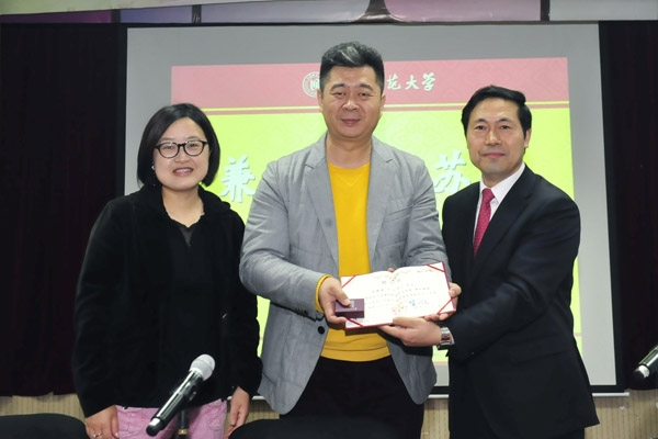 11月9日上午,我院在教苑楼B座101举行了简朴而又隆重的兼职教授受聘仪式。我院院长赵炳翔老师向中央人民广播电台《中国之声》首席播音员苏扬老师颁发兼职教授聘任书,我院党总支书记高亭老师主持了受聘仪式,赵院长和高书记表示我们很有幸能聘任苏扬老师作为兼职教授,并相信这会对我们的教学和学院发展起到积极作用。会上,苏扬老师戴上上海师范大学的校徽,自豪的说,我现在和大家是自家人,我会努力尽到一名教师的职责。我现在有三枚校徽,读书时的北京广播学院(现为中国传媒大学)、北京大学,今天任兼职教授的上海师范大学。
