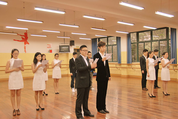 由上海市学习型社会建设与终身教育促进委员会办公室主办,东方新闻网、上海教育报刊总社家庭教育报刊分社、上海市作家协会诗歌委员会承办的第五届上海市民诗歌创作大赛选上我院播音主持专业的同学们在大赛上朗诵表演获得金奖诗歌《过去现在未来》并且从这些同学们中选出两名作为本届大赛主持人。在观看中,沈荣明主任首先赞赏了播音主持专业的朗诵水平,其次提出了舞台上朗诵表演时的要求以及要注意的地方,最后预祝同学们朗诵演出成功。