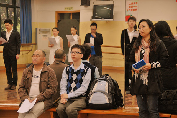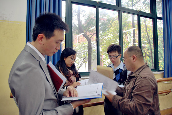 2011年11月17日下午三点时,来自上海教育报刊东方教育时报沈荣明主任在我校共青团团委副书记徐露隽的陪同下,在教苑楼一楼形体房观看并审核我院播音主持专业同学们为第五届上海市民诗歌创作大赛朗诵的诗歌《过去现在未来》,刘阳老师做现场指导。