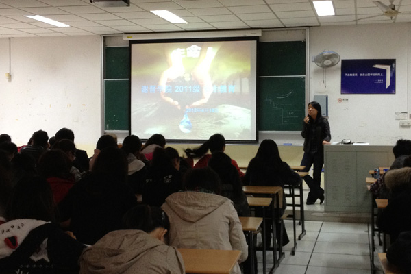 4月18日下午,以“生命”为主题的安全教育在4教119举行,全体11级学生参加。会上王姬文老师简述了清明节假期期间上海交通大学同学外出郊游遇难的事例,引导同学珍爱生命,提升安全意识。王老师又对寝室安全问题进行了教育和叮嘱,要求学生不要在宿舍内使用违章电器,注意用电安全;此外,王老师也指出在出行的问题上大家也要注意安全,不要乘坐黑车。
