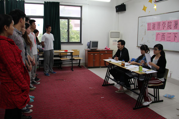 5月23日15时,2012谢晋学院暑期社会实践广西三下乡志愿者招募工作在奉贤校区五教A座219顺利开展,资深户外教练黄波、谢晋学院团委书记姚萍、学生会主席刘珂菡担任本次面试主考官,在近三个小时的面试中,31位11级同学踊跃报名参加了面试。