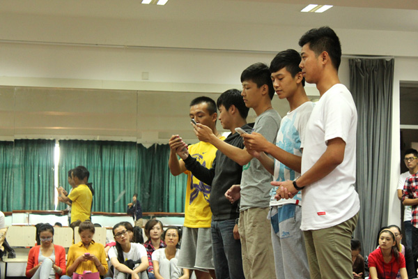 简单的开场白过后,选拔正式开始,各位同学都努力展示着自己的才艺。选拔过程中,既有中文流行歌曲《我的歌声里》的深情演绎,也有英文流行歌曲《break even》的精彩表演,选手们的声音都各有特点,演唱大方自然,赢得了评委和观众们的阵阵掌声。表演班吕嘉明同学的吉他弹唱,颇具歌星潜质。一把木吉他,一曲悠然的旋律,让大家沉醉在一片美妙的音乐天空下。之后,来自广编班田雨禾的一曲《青藏高原》将现场气氛推向高潮。她那大气的台风和惟妙惟肖的嘹亮嗓音,被大家誉为小“韩红”。紧接着便是由表演班18名男生带来的一幕别出心裁的音乐小品。特别是表演班余钦南等四位同学出演的小品,精彩又不失搞笑的段子,投入又真切的演出,让大家捧腹不止。