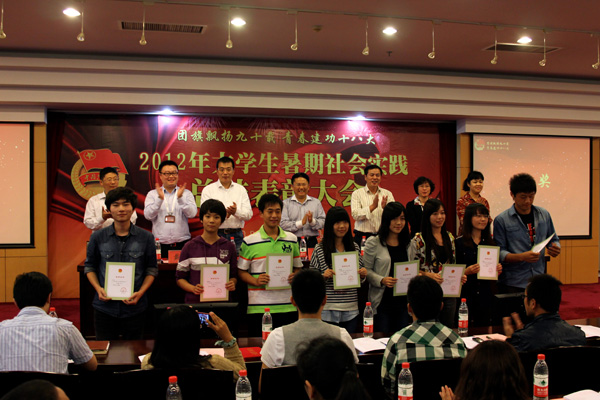 10月10日 晚18:30,上海师范大学在奉贤校区图文九楼隆重举行了“团旗飘扬九十载,青春建功十八大——2012年大学生暑期社会实践总结表彰大会”,对“最佳组织奖”、“优秀组织奖”、“最佳项目奖”、“优秀项目奖”、“先进个人”、“优秀指导教师”获得人及集体进行了表彰并颁奖。