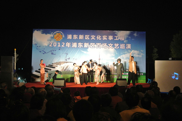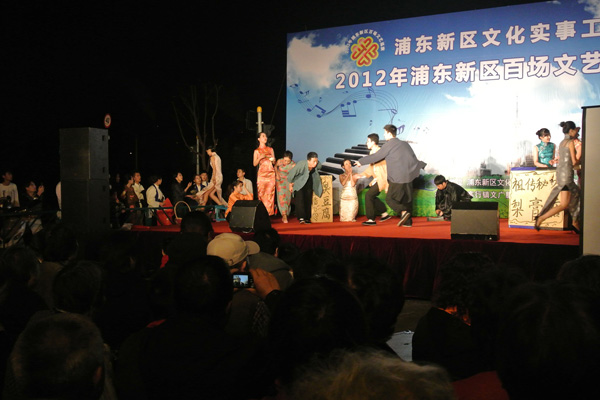 10月30日晚,在浦东新区高行镇上,谢晋影视艺术学院10级播音与主持艺术专业的学生们为浦东新区高行镇的居民们带来了众多非物质文化遗产的表演,如“码头号子”、“上海弄堂游戏”等。同学们可塑多变的语言表达、惟妙惟肖的情景表演,一下子让在场的观众朋友们近距离地感受到了上海本土非物质文化遗产的魅力。