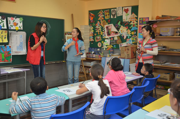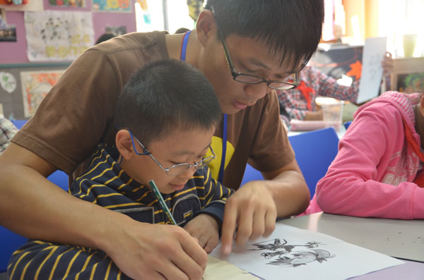2012年10月26日星期五下午,谢晋影视艺术学院广编和动画专业的4名学生到达上海市第四聋校进行授课。第一堂是美术课,两名动画专业的志愿者首先教聋校的小朋友们绘画卡通人物,小朋友们对绘画怀有极大的热情,跟着志愿者教的内容一步步的将卡通形象画出来。虽然小朋友们听不到她们所讲的话,但通过聋校在校老师和听力较好的同学的翻译,小朋友们都能明白每一步要怎么画。在绘画过程中,我院的两名志愿者到各个小朋友身边,手把手进行指导,不能用语言交流就用文字和肢体语言让大家能画出更好的作品。第二堂是摄影课,我院广编专业的志愿者同学拿着单反给小朋友们仔细讲解了摄影的简单原理,由于相机较于复杂又不能直接让学生们听到所讲内容,所以无法真正的明白具体的功能,但小朋友们对志愿者带去放映的图片兴趣颇高,在志愿者讲述照片里的内容的时候,大家都很认真的看着图片和旁边老师的手语翻译,另有两名学生拿着单反在教室里拍照实验。下午4点左右,志愿者们和小朋友们挥手再见,本学期第一次爱心学校授课活动圆满结束。