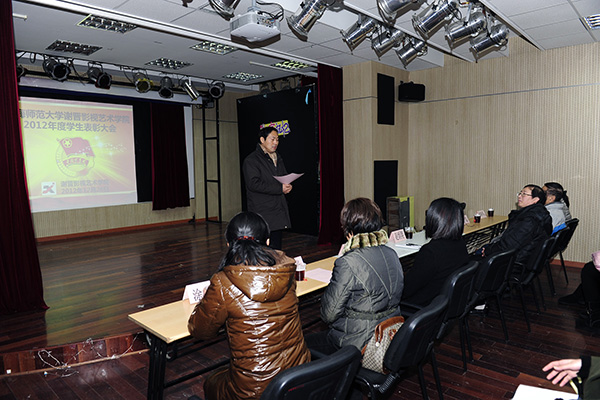 12月26日,在教苑楼B座101举行了2012年度上海师范大学谢晋影视艺术学院学生表彰大会。参加此次表彰大会的有院长赵炳翔、党总支书记高亭、副院长翁敏华、副书记副院长孙雅艳、副院长丁宏法、动画专业负责人强小柏、工会主席涂晓老师、院办主任翁晓玲老师、学工组长王姬文、团委书记姚萍等领导和老师,以及2010级、2011级学生出席了此次活动。