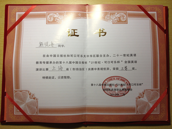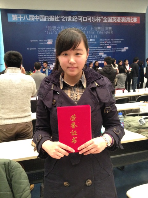 12月29日下午,第18届中国日报社“21世纪·可口可乐杯”全国英语演讲比赛“雅思之星(IELTS STAR)”上海市决赛在东华大学落下帷幕。在高手如云的比赛中,我院12级广播电视编导专业学生熊悦舟在此次大赛中荣获上海市三等奖。