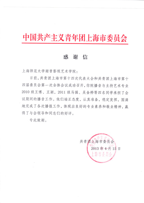 近日,我院收到共青团上海市委员会的一封感谢信。信中写道:共青团上海市第十四次代表大会和共青团上海市第十四届委员会第一次全体会议在上海展览中心成功召开,你院播音与主持艺术专业2010级王博、王颖,2011级马强、吴金桦等四名同学承担了会议期间的播音工作。他们端正态度,认真准备,稳定发挥,圆满完成了各次播报工作,体现出良好的专业素养和敬业精神,赢得了与会领导和同志们的一致好评。专以致谢。