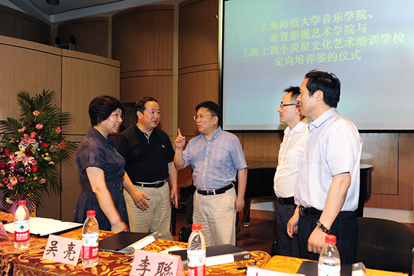 6月19日下午,我校音乐学院、谢晋影视艺术学院与上海上视小荧星文化艺术培训学校定向培养合作协议签约仪式在音乐学院小音乐厅举行。校党委副书记、副校长王莲华,音乐学院院长李聪、谢晋学院院长赵炳翔、谢晋学院党总支书记高亭等学院负责人,上视小荧星文化艺术培训学校常务副校长吴亮、副校长杨进以及多名教研组组长,两个学院的报名学生共同出席了此次签约仪式。