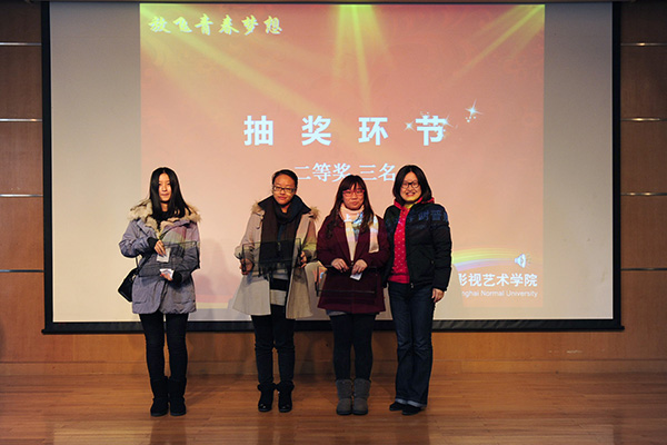 12月25日,正值圣诞佳节之际,我院在徐汇校区文苑楼二楼报告厅举行了“放飞青春梦想”上海师范大学谢晋影视艺术学院2013-2014年度颁奖典礼暨班导师总结会。我院院长赵炳翔、党总支书记高亭、副书记兼副院长孙雅艳,副院长丁宏法、邱乙哲,专业负责人王平、强小柏、康爱石以及各班班导师出席,我院全体同学参加了此次大会。