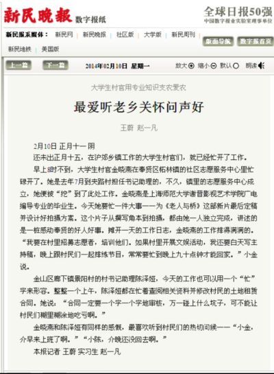 4月11日下午,上海师范大学“2014年基层就业校友报告会”在文苑楼2楼报告厅举行。我院2013届广播电视编导专业优秀毕业生金晓燕受邀参与了此次会议,并向大家分享了她走上村官这条道路的经历与感受。2013年毕业前夕,金晓燕放弃了与专业非常对口的工作,离开大都市,拥抱小农村,报名参加村官的选拔工作。通过学校、学院等方面的宣讲和层层选拔,2013年7月,她被分配到柘林镇夹路村担任村书记助理一职,后又到柘林镇宣传部下属的社区志愿服务中心开展工作。她运用专业特长为所在单位的“视频库”创建贡献了积极的力量。从剧本的撰写、人员联系、现场录制、后期处理等,她都亲力亲为。同时,她还去社事中心客串,比如演小品、歌伴舞、主持等。她的身影穿梭在村民需要的每一个场所,她的问候总是温暖乡亲们的心坎。因她出色的表现广为流传,她的事迹曾被新民晚报报道。在题为《最爱听老乡关怀问声好》的报道中,她的朴实情怀,她的爱岗敬业,她的无私奉献生动的呈现在我们面前。正如她在报告中所说:工作的意义,不在于能做多大的事,而在于是不是被人所需要。在农村工作是一种历练,广阔的土地给了她更大的舞台,她无悔于自己的选择。年轻人在农村大有作为,她鼓励学弟学妹们在就业时,不妨可以考虑“大学生村官”“三支一扶”等工作,到农村去,到基层去,到人民需要的地方去,以实际行动,回报我们的祖国。最后,她很感谢学校、学院一直以来的培育和关心。金晓燕同学在校期间表现突出,曾担任班级和学院的学生干部,获得专业奖学金,多次参加学校、学院组织的各项志愿服务活动,是我院优秀的学生代表,她的成长也体现了我院培养德艺双馨人才的办学理念。(谢萱)