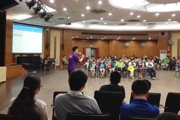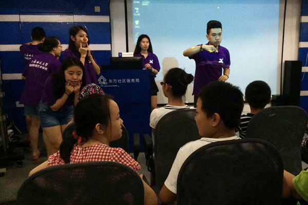 在开班仪式结束后,我院的小教员们便马上投入到了教学当中,开始了爱心学校的“开学第一课”,所有小朋友都聚在一起上课,教员们从基础的发声开始教,然后又带领小朋友们观看了小黄人的视频,并进行讲解。课程结束后,小朋友们都纷纷表示不要下课,要求再上一会儿课!可见,我院的暑期爱心学校在社区中深受到广大小朋友和家长们的欢迎!