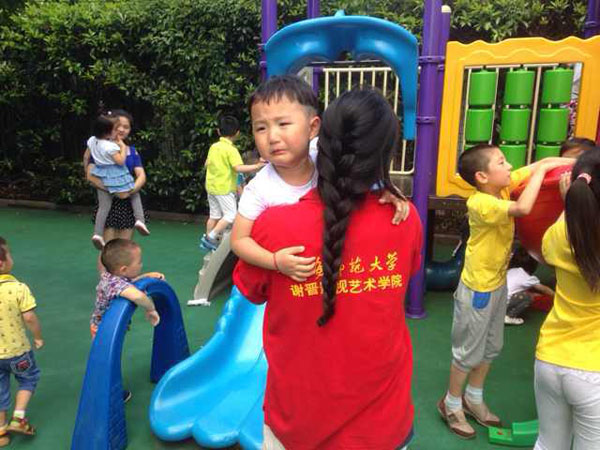 在爱心学校里面,教员们除了教授沪川幼儿园的孩子们播音、表演专业的知识外,更多的时间是辅助幼儿园老师们照看小朋友,帮助刚进入幼儿园开始独立生活的孩子们打饭、倒水、搬床、哄他们睡觉,让他们在陌生的环境中体会到家的温暖,帮助他们尽快的适应幼儿园的生活。他们的角色随时变化着,哪里需要便随时奔向哪里,在这角色不停变化之间,我院的教员们都获得了属于自己的成长。大家都觉得沪川幼儿园的孩子们就像自己孩子一样,看着他们的笑脸就真的不觉得累。教员们每天带着孩子们穿行在大街小巷中,渐渐明白了肩头这份责任的沉重,渐渐懂得了成长的不易。