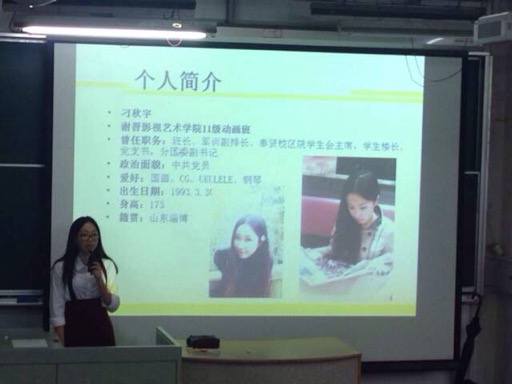 2014年10月29日中午,谢晋影视艺术学院优秀学生经验分享之 “朋辈交流会” 在徐汇校区第一教学大楼207教室召开。交流会由13级兼职辅导员杨明骁主持,2013级的学生们耐心聆听了成功推免至中国传媒大学硕士研究生的11级动画专业刁秋宇同学以及我院的直升硕士研究生武班笑薇同学,分享她们大学四年的学习与生活经历,2013级的同学与两位优秀学生积极互动,并对自己面临的困惑提出疑问。