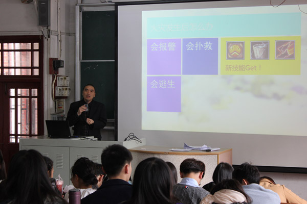 陆老师以生动的ppt、视频等形式为我们讲解了与大家生活息息相关的安全知识。首先他从最近女大学生频频遇害切入主题,再通过2014年1-6月上海市高校人员伤亡事故统计数字让同学们直观感受到安全意识的重要性。同时,陆老师还列举了引发学生宿舍火灾的主要原因:如使用违章电器,违章用明火点蚊香,使用热得快等等。并教会我们火灾发生后如何逃生、如何报警、如何扑救,如何逃生等等,这些实用的知识让同学受益匪浅,纷纷拿出笔记本记录。