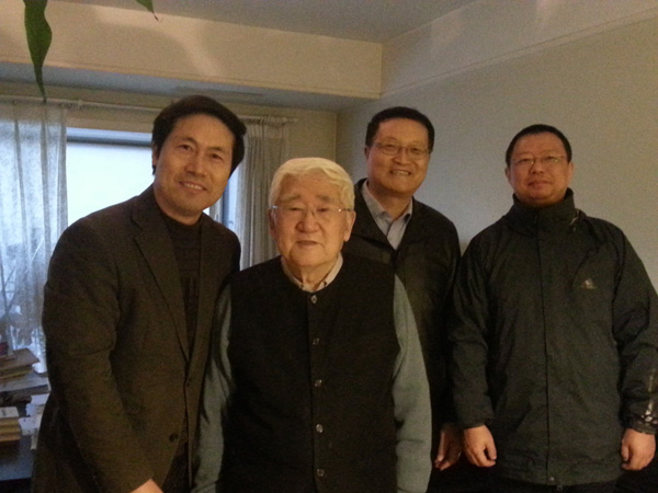 落座之后,朱恒夫教授向曲老详细介绍了国家社科基金重大项目《中国傩戏剧本的整理与研究》的相关情况,并对曲老在申报过程中所给予的大力帮助表示衷心感谢;赵炳翔院长介绍了自己在子课题中所承担的研究内容,并转达了谢晋影视艺术学院对曲老的问候;赵院长和陈劲松副教授还以中国傩戏学研究会新会员的身份向曲老表达了敬意。曲老如今已迈入耄耋之年,但精神依旧矍铄,对三人的拜访十分高兴。
