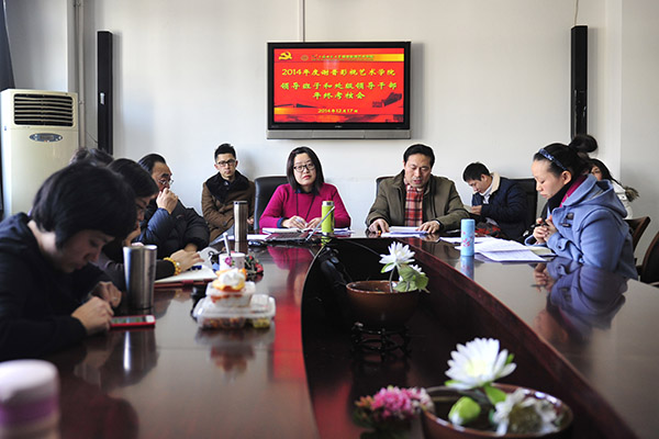 会上,赵院长代表学院领导班子对2014年度工作进行总结。在过去的一年中,学院领导班子带领全院教职工恪守本职、兢兢业业,在党建工作、学科建设、教学改革、学生工作、艺术实践、国际交流与合作、校庆60周年工作、民生与凝聚力建设等各方面都取得了丰硕的成果。听取总结后全体教职工前往教苑楼B座二楼机房,从网上阅览了我院6位处级领导干部每人上传的2014年度工作小结,大家对学院领导班子和领导干部个人进行了网上考核。
