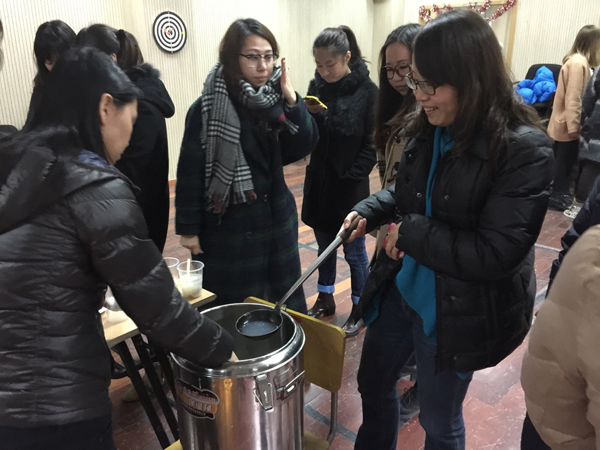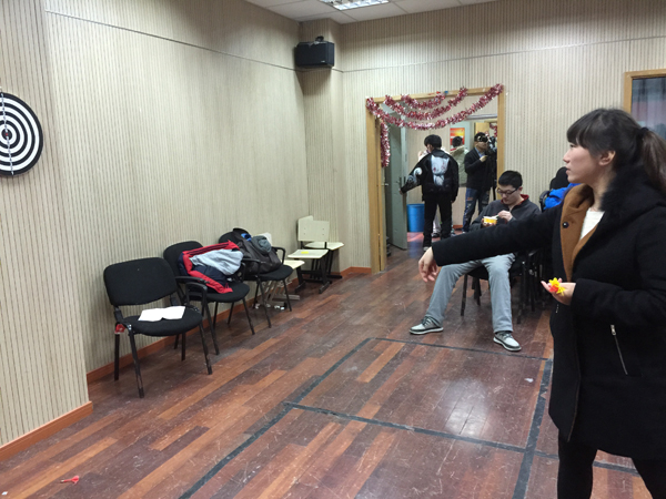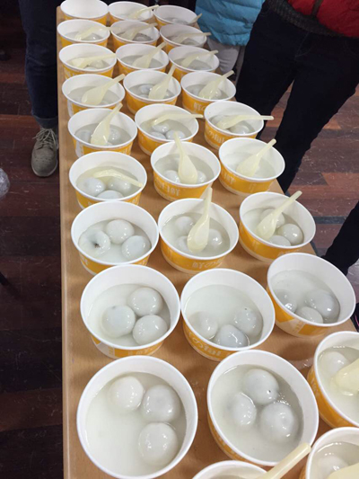 欢度元宵活动包括四个项目:飞镖、弹球、猜灯谜和吃汤圆。每位挑战者都有机会参加游戏,如果三关全过就可以尝到美味的汤圆了。参加游戏的人很多,大家玩得十分high,看那个瘦高的男生,飞镖扔得好准呀,duang的一下,就射中靶心了。嘿,那个女生,弹球怎么一个都没进呢?看来要罚两个汤圆了。猜灯谜是最难的环节,有些同学几次都没猜中。大家凭着游戏集章“赢取”到自己的汤圆,吃着热乎乎的汤圆,嘴里洋溢着幸福的笑,瞧那一个个汤圆,象征着团团圆圆。虽然有些外地学生无法回家和家人一起过元宵,但这次活动让他们感受到了家的温暖。(丰屹)