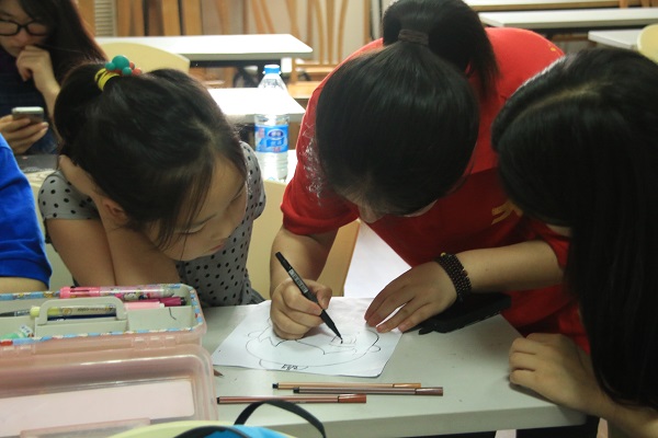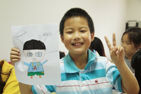 卡通绘画班的孩子们虽然是用笔杆子上课,但是气氛的活跃一点也不比配音班弱。这一节绘画课就从孩子们落在黑板上的视线开始了——几个卡通形象的人物。聪明的小同学们主动说出这节课的内容,就是画一个自己的漫画像。主讲姜悦老师从基础的辅助线教起,在横平竖直的辅助线间勾勒出漫画形象的小朋友的外形。孩子们仔细观察着老师的运笔,观察相互间和自己的外形特征,在轮廓中补充修改,终于画出了一幅幅属于自己的人物漫画像。在细节上主讲老师和两位助教老师耐心手把手教孩子们各种画出可爱的、生动的人物五官的技巧,带领孩子们领会什么样的搭配是美的、和谐的。在这样的教学内容里,孩子们学习的不仅仅是绘画的技巧,也是审美的体验和塑造。