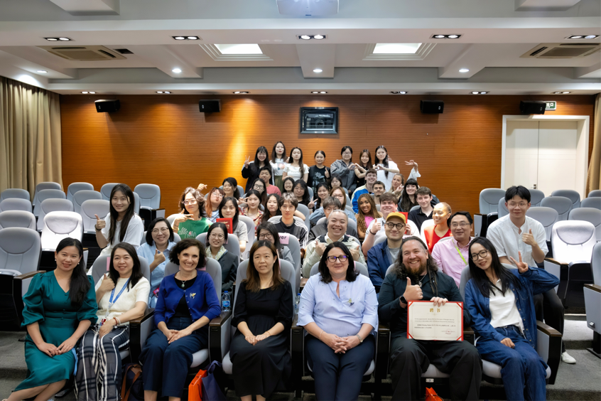 2025528日晚,我校影视传媒学院与英国利物浦约翰·摩尔大学影视学院共同举办的2025中英国际纪录片工作坊结业仪式在第四教学楼B101举行。英国利物浦约翰·摩尔大学教授Lydia Papadimitriou,高级讲师WeZ Nolan,中国办公室Lucy老师、Clover老师,广播电视编导专业主任陈双寅副教授、副主任叶挺副教授、广播电视编导专业许迪声副教授、刘俊老师、广告专业戴菲副教授、院新闻办与对外交流办公室主任张婉婉以及中英两校共24名工作坊学生出席了此次结业仪式。