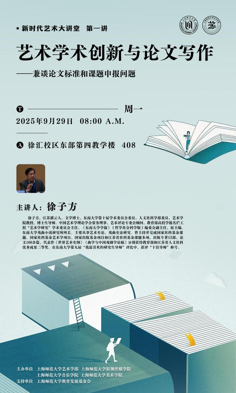 2025 年 9 月 29 日上午,著名艺术理论家、东南大学学术委员会委员、人文社科学部委员、博士生导师徐子方教授,应上海师范大学艺术学部邀请,以《艺术学术创新与论文写作——兼谈论文标准和课题申报》为题,为学部师生带来一场兼具学术深度与实践指导价值的专题讲座。讲座由校学术委员会主任、艺术学部部长朱恒夫教授主持,他对徐子方教授在艺术理论研究领域的深厚造诣、学术成果及研究方向作了热情洋溢的介绍,为讲座拉开序幕。