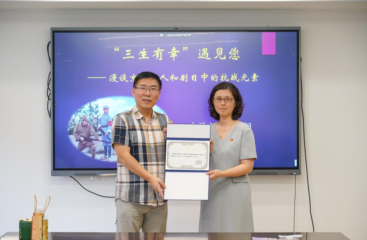 活动伊始,杨康贤书记为穆晓炯老师隆重颁发了《上海师范大学影视传媒学院行业导师》聘书。在之后的讲座中,穆老师围绕“京剧艺人爱国斗争精神”与“京剧剧目中的抗战题材作品”两条主线娓娓道来:首先,他以“梅兰芳蓄须明志”“程砚秋隐居务农”“周信芳投笔创作”等事例,生动地讲述了京剧艺人在民族危亡时期所展现的文化担当与精神力量;然后,他又结合京剧现代戏影片《平原作战》片段,既阐明了用京剧艺术表现抗战题材时,所采用的以局部斗争管中窥豹的创作手法,又展现了“四法”在情节推进中的巧妙运用。
