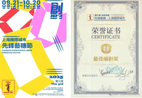 在10月20日举行的第三届上海国际城市先锋艺穗节闭幕式暨颁奖典礼上,由影视传媒学院师生共同打造的肢体剧《木盆记》脱颖而出,在27部优秀剧目、近百场演出中,凭借深刻的文本与精巧的叙事,斩获“最佳编剧奖”。