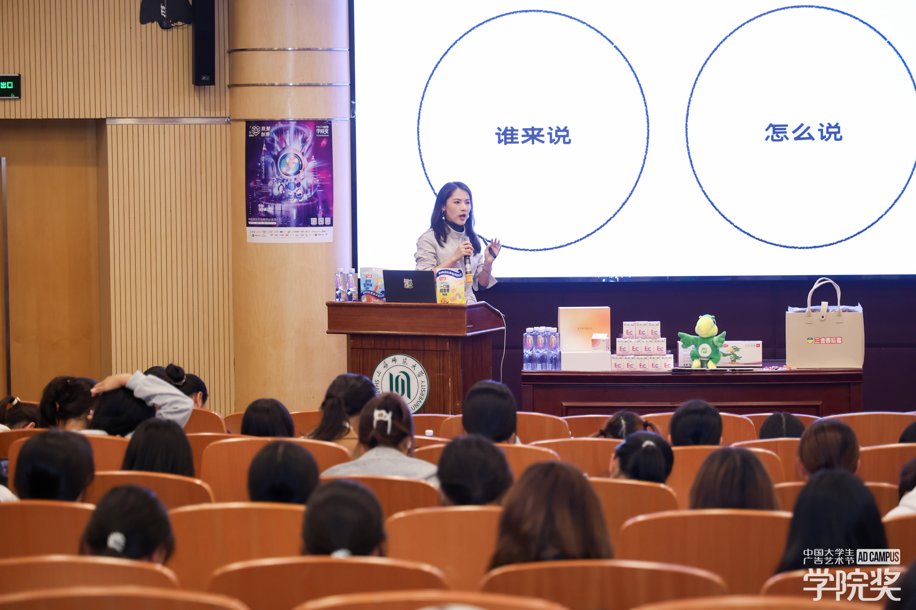 她指出,每个人都是“灵感的拥有者”,生活中的所见所闻、奇思妙想都是创意素材。在分享过程中,她将创意方法论拆解为“谁来说”与“怎么说”两大核心板块,并结合多个经典案例展开讲解。深入浅出的讲解为同学们开拓创意思路,赢得了在场师生的一致好评。