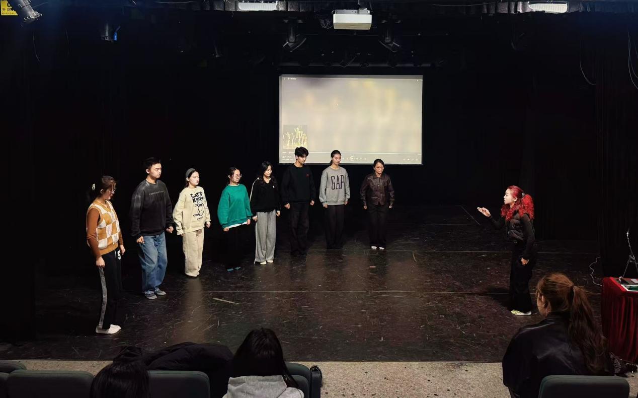 互动环节中,高颢瑜带领同学们现场体验了铃木忠志演员训练法的基本动作,让大家在实际练习中感受身体控制与舞台能量的关系。现场气氛热烈,不少同学表示对戏剧训练的方法与路径有了更直观的认识。