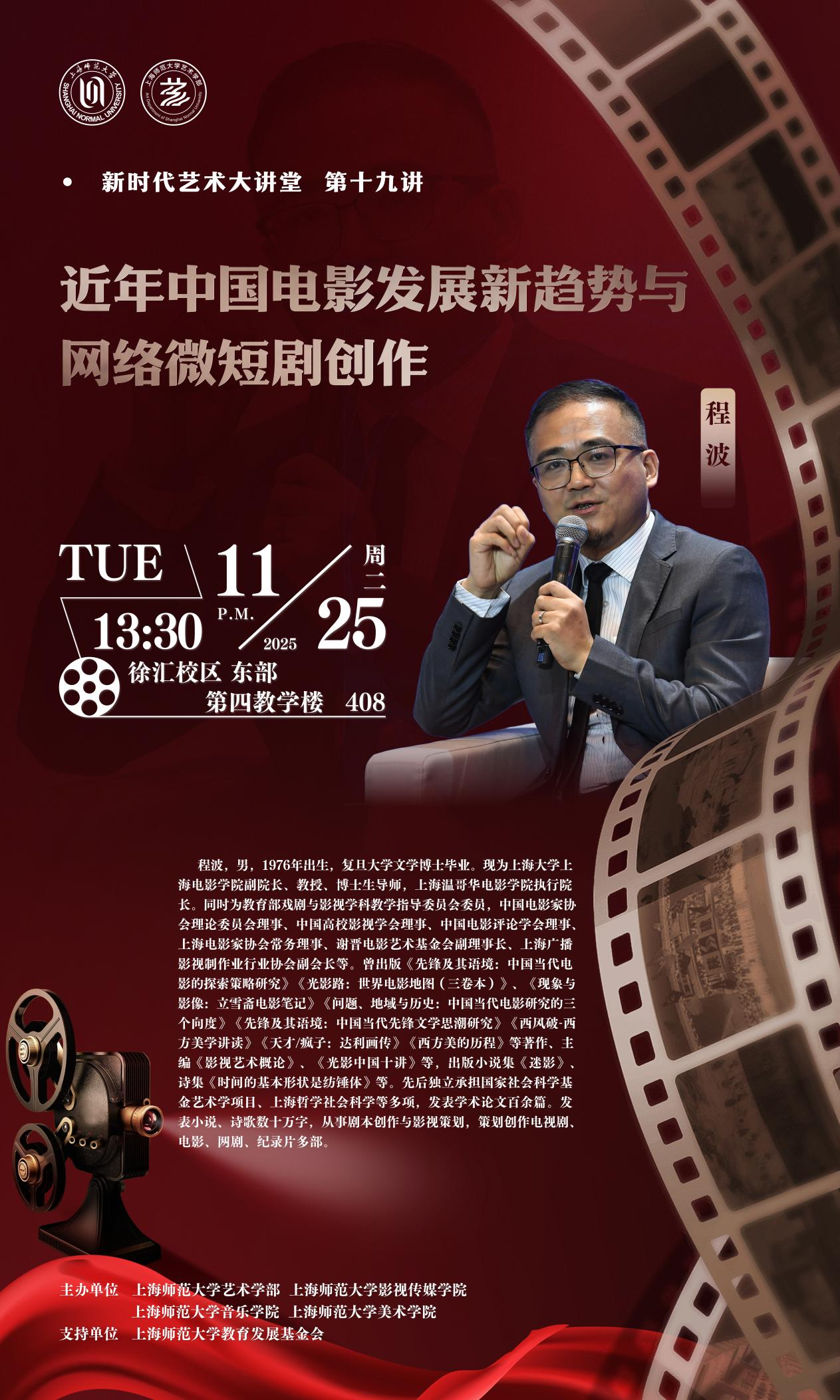 2025年11月25日下午,上海师范大学艺术学部在徐汇校区举办专题学术讲座。上海大学上海电影学院副院长、上海温哥华电影学院执行院长、博士生导师程波教授,应邀以“近年中国电影发展趋势与网络微短剧创作”为题,为师生带来一场融合产业观察、创作实践与理论思考的精彩报告。讲座由影视传媒学院副院长齐青教授主持。
